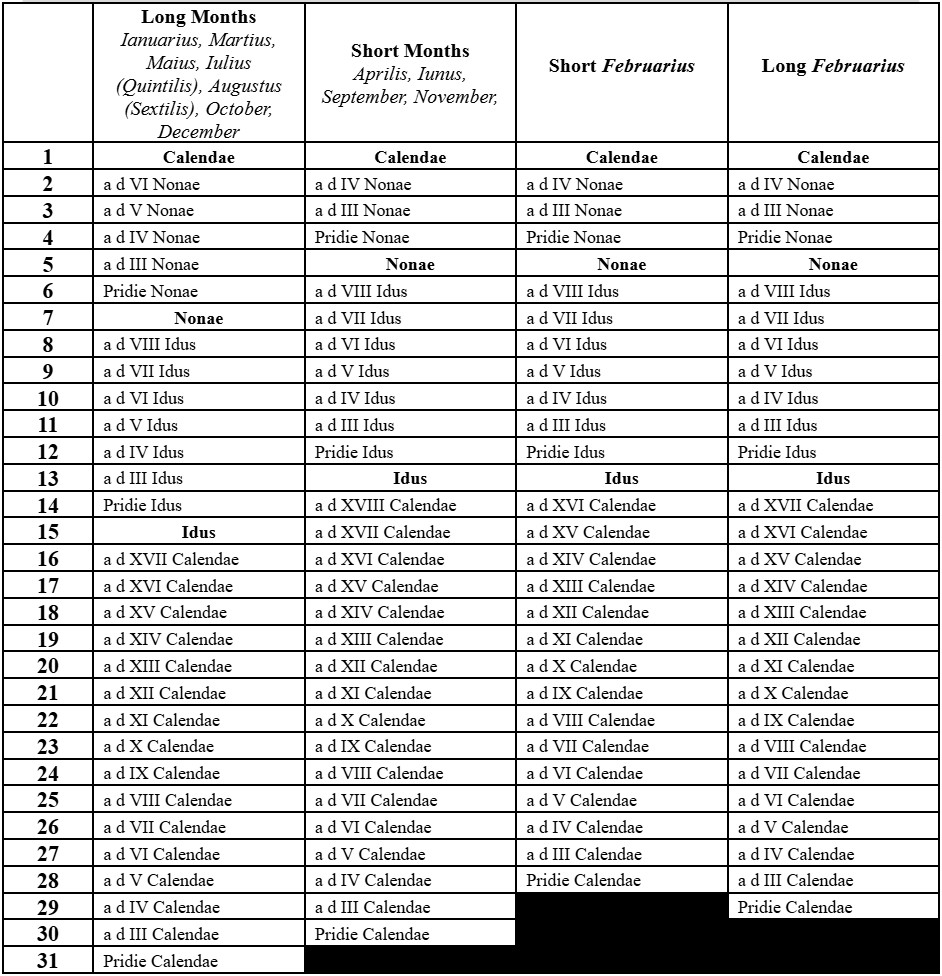 Chart of Roman Days of the Month Based on the Julian Calendar